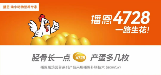播恩4728,一路生花。為解決蛋雞養(yǎng)殖的營(yíng)養(yǎng)痛點(diǎn),提供更專業(yè)細(xì)致的飼料營(yíng)養(yǎng)呵護(hù),播恩對(duì)產(chǎn)品創(chuàng)新迭代升級(jí),并全新推出4728蛋雞營(yíng)養(yǎng)系列新品。該系列產(chǎn)品均采用播恩補(bǔ)鈣技術(shù),完美解決鈣消化、鈣吸收和鈣沉積三大命題,已申請(qǐng)專利保護(hù)。新品覆蓋了蛋雞育雛、育成、產(chǎn)蛋和淘雞4個(gè)時(shí)期的7個(gè)核心營(yíng)養(yǎng)產(chǎn)品:開口料H000、育雛料H041、育成料H042、產(chǎn)蛋料H353/H033,伴產(chǎn)寶、伴殼寶、伴淘寶。具有更強(qiáng)的產(chǎn)品力及競(jìng)爭(zhēng)優(yōu)勢(shì),有效滿足專業(yè)化蛋雞養(yǎng)殖營(yíng)養(yǎng)需求。