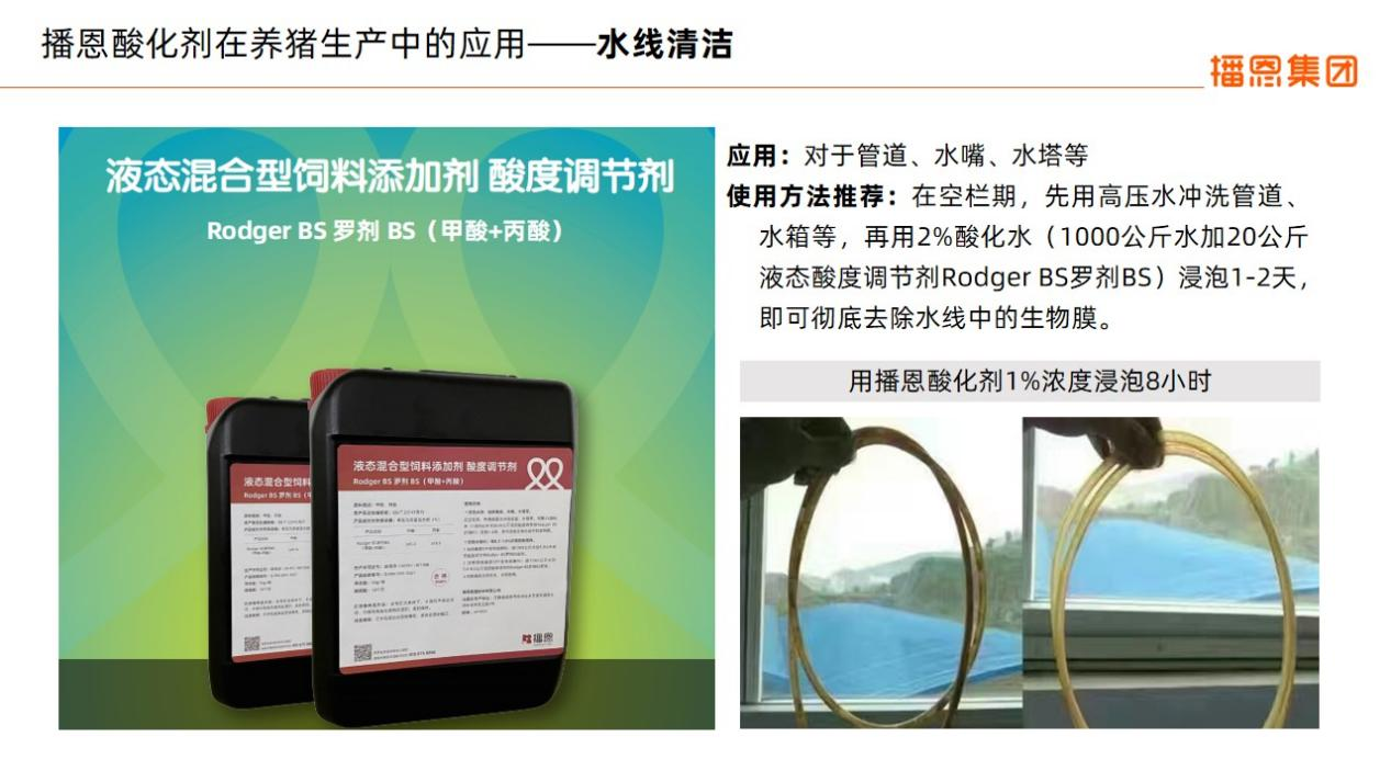他指出,酸化劑可以降低生豬胃腸道pH值,減少大腸桿菌、沙門氏菌等致病菌的數(shù)量。播恩集團液體酸化劑具有豐富的技術歷史沿革,特點是高效、安全、穩(wěn)定、促健康等。酸化劑主要運用在豬場消毒、清潔、動物飲水添加等多方面,可有效抑菌、抗病毒,提升豬場生產(chǎn)性能。