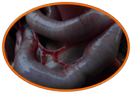 2.3.2 腸道:剖檢可見小腸粘膜肥厚,充血,可見蟲體吸附于小腸粘膜上。寄生部位呈針尖大結節(jié)樣病變,中央凹陷。大量蟲體聚集時,引起腸堵塞,可造成腸破裂和腹膜炎。嚴重時導致死亡。見圖4。