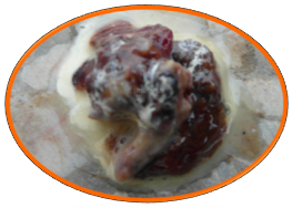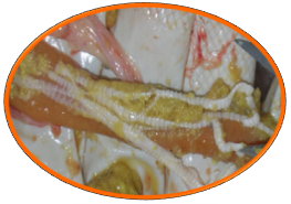 3- 糞便上有米粒大小,乳白色的節(jié)片    4- 腸粘膜肥厚,可見蟲體吸附于小腸粘膜上