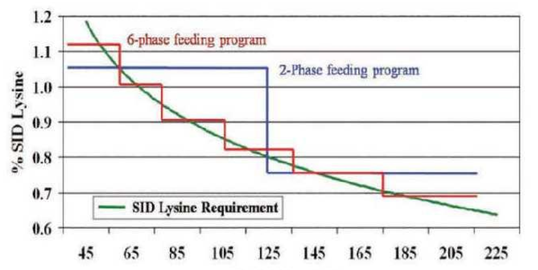 1展示的是商品豬從保育到育肥出欄,分兩階段飼喂和六階段飼喂的差異。兩種配方飼喂方法雖然操作簡單,但會造成飼料隱性浪費(fèi)??紤]到前期豬群體重小采食量低,飼料營養(yǎng)濃度一般較高,導(dǎo)致豬在生長過程中大多數(shù)時間處于營養(yǎng)過剩階段,營養(yǎng)物質(zhì)不能充分利用,多余的營養(yǎng)素増加了豬的代謝負(fù)擔(dān),且會隨糞便排出體外,造成飼料成本增加。過剰的營養(yǎng)還會增加糞便排放量,增加糞污處理難度。而多階段料飼喂則是比較精細(xì)化的飼喂方式,可保證豬群大多階段營養(yǎng)物質(zhì)的攝入正好可滿足自身的需要,依靠這種飼喂方法可滿足豬群的實(shí)際氨基酸需要,實(shí)現(xiàn)精準(zhǔn)飼喂及有效降低生產(chǎn)成本。在設(shè)計(jì)多階段日糧飼喂方案時可通過原料及營養(yǎng)指標(biāo)梯度設(shè)計(jì)來減少換料應(yīng)激。