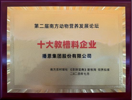 2024年7月14-16日,以“南方問道,融合知新”為主題的2024第二屆南方動物營養(yǎng)發(fā)展論壇在廣西南寧隆重召開。該論壇作為南方地區(qū)規(guī)模大、規(guī)格高、陣容強的動物營養(yǎng)領(lǐng)域盛會,吸引了近700位畜牧水產(chǎn)業(yè)的大咖齊聚。播恩集團(tuán)由欽州播恩總經(jīng)理楊春帶隊參與,并憑借在動物營養(yǎng)領(lǐng)域的卓越表現(xiàn)和優(yōu)質(zhì)的教槽料產(chǎn)品,在此次論壇上獲得了“十大教槽料企業(yè)”榮譽。