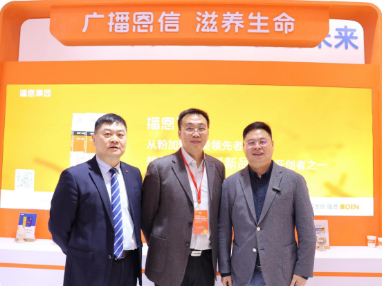 農(nóng)業(yè)農(nóng)村部畜牧獸醫(yī)局飼料飼草處黃慶生處長(圖左二)一行蒞臨播恩展位參觀指導(dǎo)
