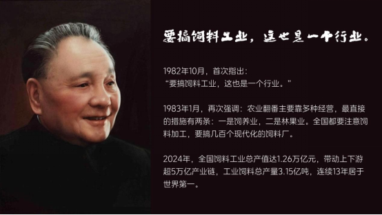 1982年10月,“要搞飼料工業(yè),這也是一個(gè)行業(yè)”被提出,如今,中國飼料工業(yè)已成為全球標(biāo)桿。2024年,全國飼料工業(yè)總產(chǎn)值達(dá)1.26萬億元,帶動上下游超5萬億產(chǎn)業(yè)鏈,工業(yè)飼料總產(chǎn)量3.15億噸,連續(xù)13年居世界第一,73萬從業(yè)者正以精銳之師支撐起全球最大飼料產(chǎn)業(yè),實(shí)現(xiàn)從“量”的積累到“質(zhì)”的跨越。這數(shù)據(jù)的背后,是“中國力量”。