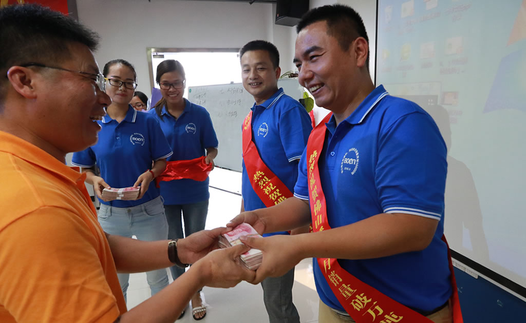 頒獎儀式上,公司對達(dá)成本次萬噸目標(biāo)表現(xiàn)優(yōu)異的省區(qū)給予了相應(yīng)的表彰與獎勵。隨后,曾紹鵬為獲獎省區(qū)頒獎?;葜菔^(qū)、廣西大區(qū)、海南愛佑完成了月度銷量和總銷量兩項指標(biāo);肇慶省區(qū)、肇慶全價料、江門省區(qū)、粵西大區(qū)、梅州省區(qū)達(dá)成了月度目標(biāo)銷量,以上8個省區(qū)均獲得了現(xiàn)金重獎。獲獎代表們配上授帶,接過鮮花,展示著嶄新的一疊疊人民幣,整個會場充滿了歡呼聲與尖叫聲。